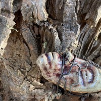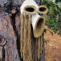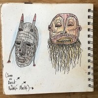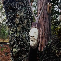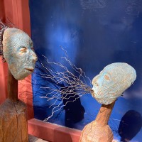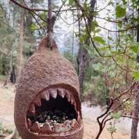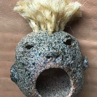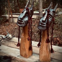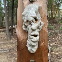 A friend’s mask of uncertain origin inspired these heads. Perhaps a forest spirit or guardian from ________? Certainly not malevolent devils, these two heads now watch us from the eaves of our outdoor kitchen. (Peter)