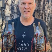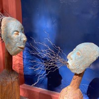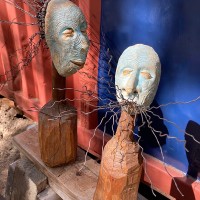 A selection of ceramic heads from 2018 to the present. Many of these have been placed in the woods up at our land in the Sierras, and others are in private collections. (Peter)
